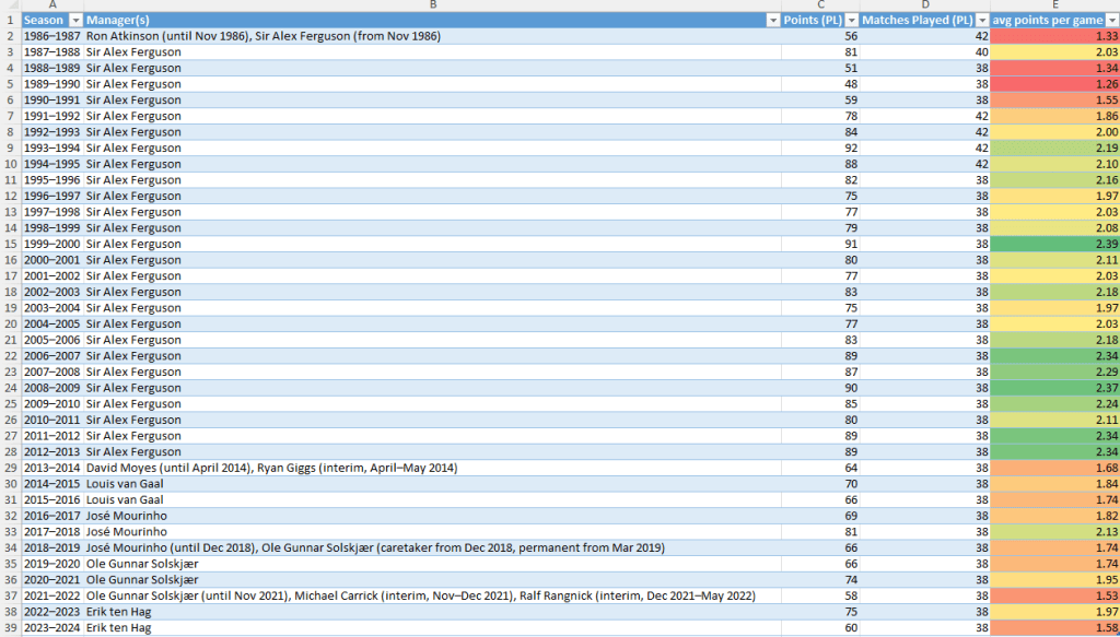 We can see from the data that Sir Alex Ferguson had some low output regarding AVG points per game between 1986-1992, with the exception of season 1987–1988 (from now on we will call this “AvgPPG” = points total end of season / games played per season). That is five full seasons in which AvgPPG was below the 2.0. In modern day football such results would get you fired within 3 seasons. However, Sir Alex Ferguson was given the time to start and finish his project: